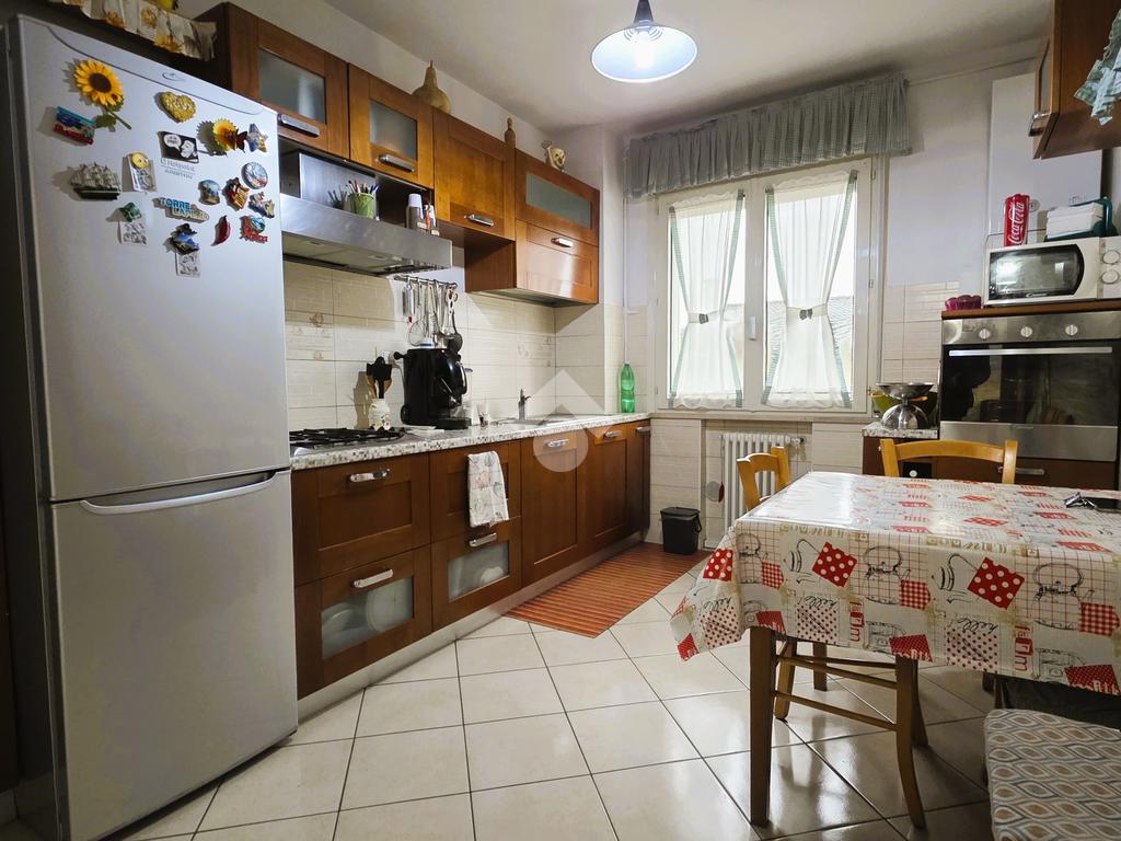 Dall'ingresso accediamo alla zona giorno con cucina abitabile e separata dal luminoso soggiorno con accesso al primo balcone ed è inoltre presente un ripostiglio.