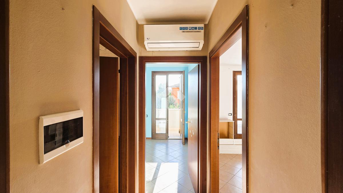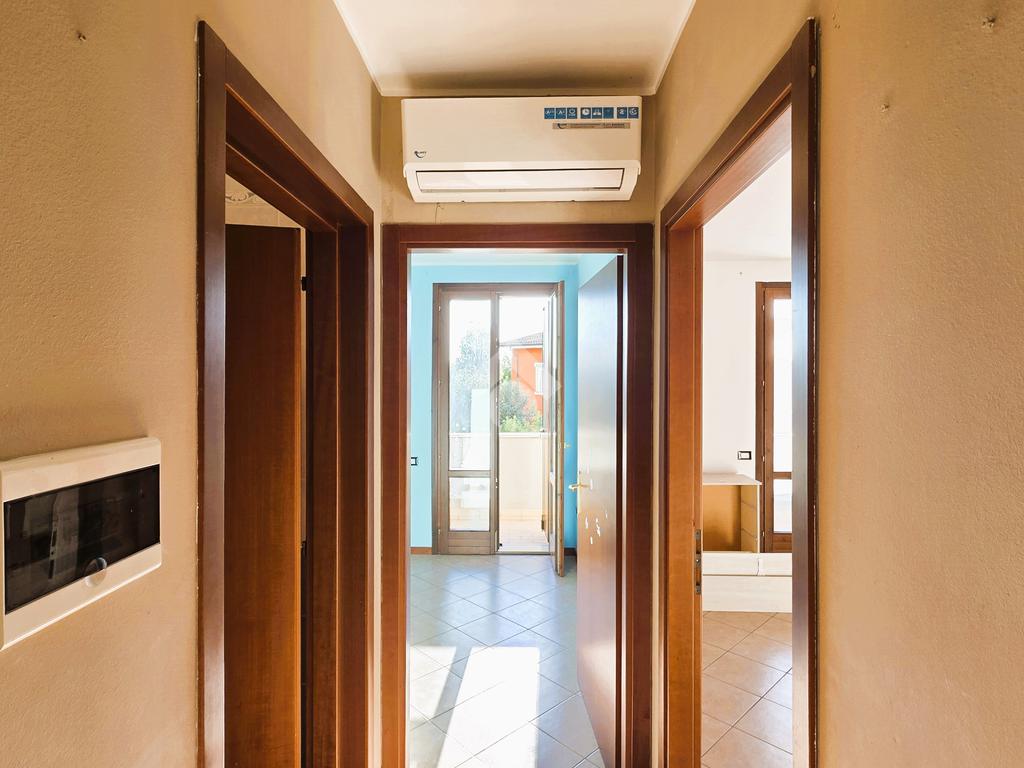 Attraverso l'ampio porticato accediamo alla zona giorno composta da soggiorno con cucina in openspace, tramite un corridoio abbiaomo le due camere da letto (una matrimoniale ed una tre/quarti) dotate di balcone ed infine il bagno.