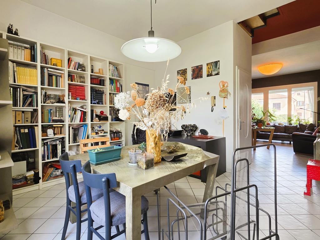 L'ampia zona giorno, disposta al piano rialzato, è composta da una cucina abitabile, il soggiorno dotato di accesso al balcone e dalla sala da pranzo con accanto un bagno di servizio. Tramite il corridoio posto centralmente accediamo infine ad il bagno principale ed ad una stanza attualmente adibita a camera da letto matrimoniale.